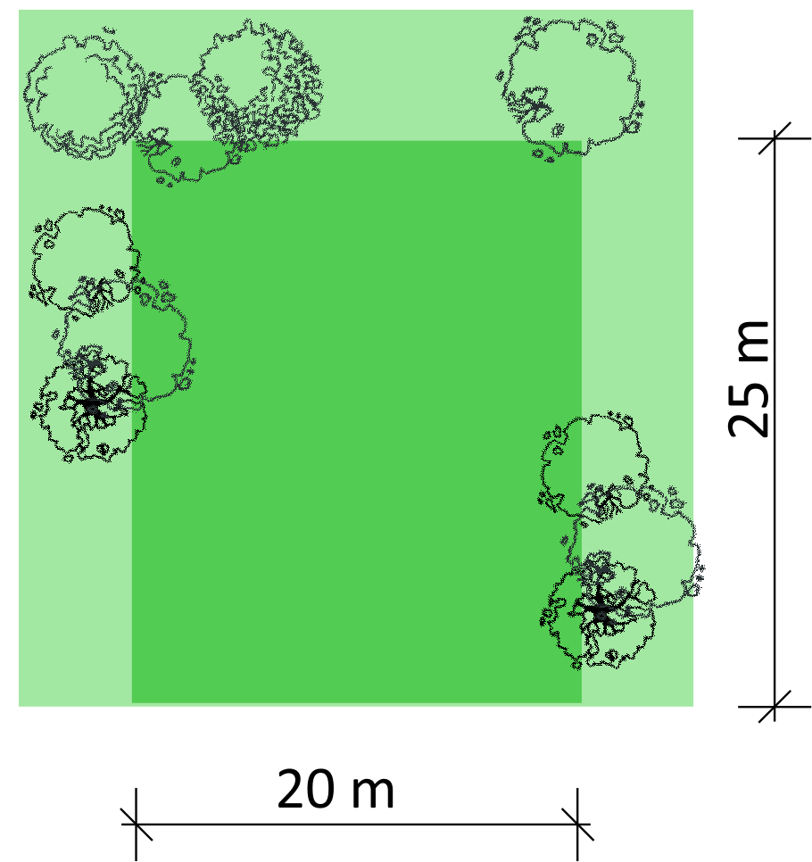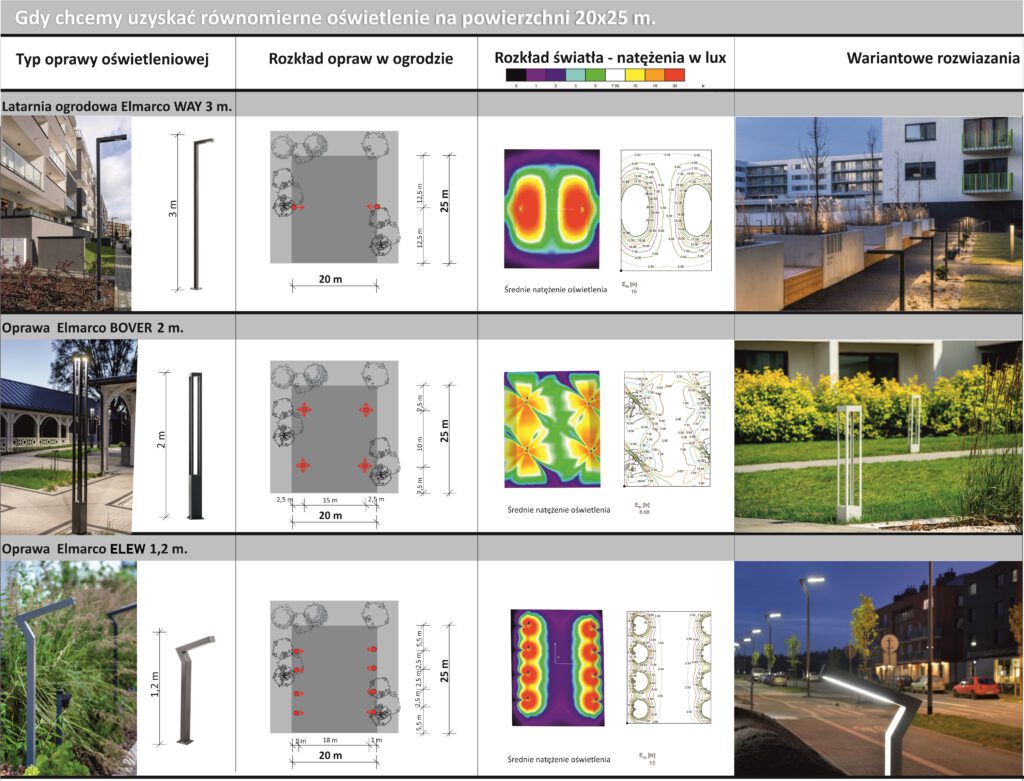 Examples of garden lighting with dimensions of 30 × 25 m and a uniform lighting area of 20 × 25 m.