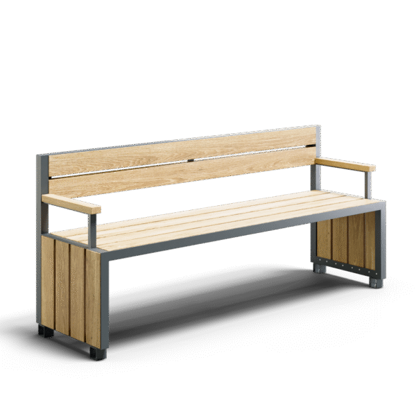 A modern-design city bench combining an aluminium structure with natural wood. Its simple form and solid materials ensure durability and comfort of use. It is ideal for public spaces, parks, housing estates and promenades, creating an aesthetic and functional place to rest.